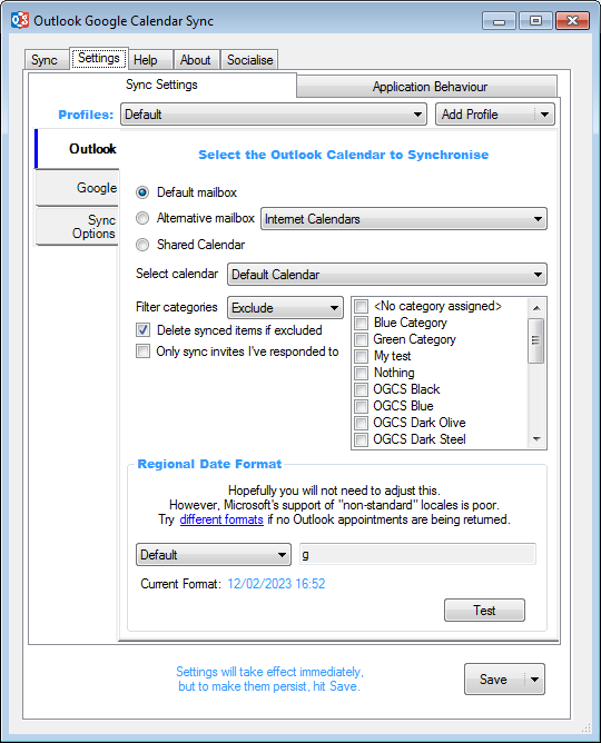 Regional Date Format: If OGCS is not finding any Outlook items to sync, even though you know they definitely exist, you will likely need to change this setting. As explained within the application, Microsoft does not appear to support a uniform method by which to translate date text into a date range and then use this to retrieve Outlook calendar items. Unfortunately, this gets worse for non-English locales.